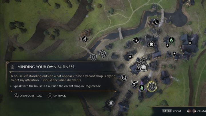 To start the quest, talk to a house-elf who sweeps the street in front of a small abandoned shop in Hogsmeade, near Ollivanders'.