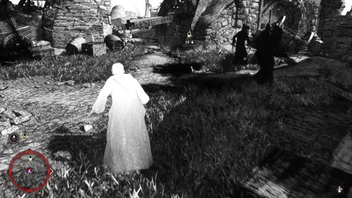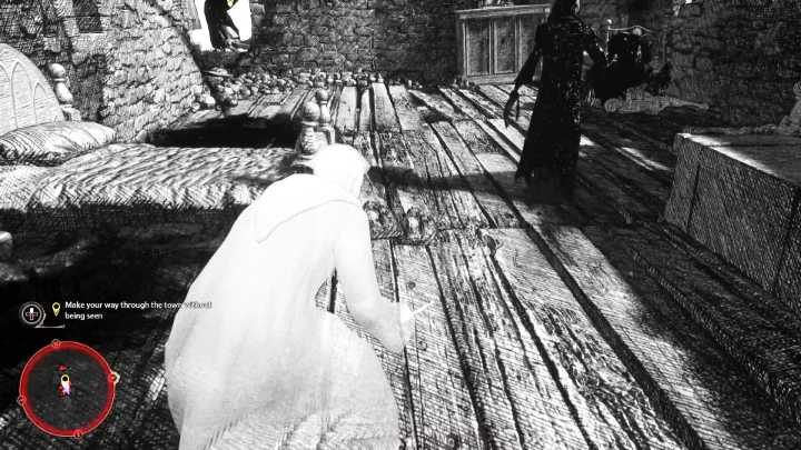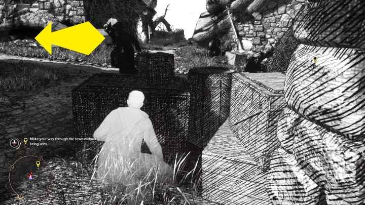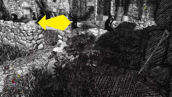 Stop for a moment and wait for the character on the left to turn away from you and walk behind him, keeping to the left side . Be careful not to get too close to the opponent who is standing a little further away.