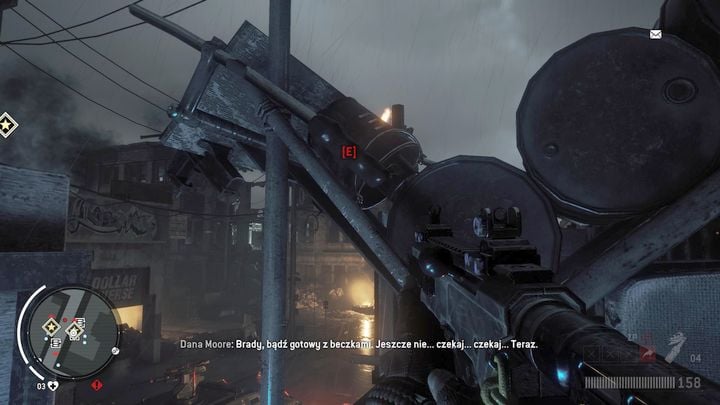 The moment Dana gives you the sign, destroy the hook protecting the trapdoor, and shoot the red barrels to get rid of the armored vehicle. You will have a great view on the whole combat area. Don't get downstairs until you get rid of the bigger part of the enemies.