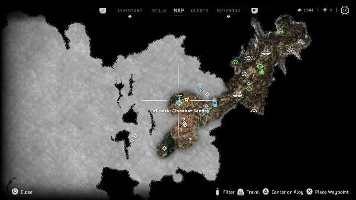 This page of the Horizon Forbidden West guide contains the location of the Tallneck found in the Cinnabar Sands region. Tallnecks are special activities which uncover large parts of the map. You must remember though that they only show the terrain layout, not specific activities. This means they'll fill your map with question marks you'll have to discover on your own.