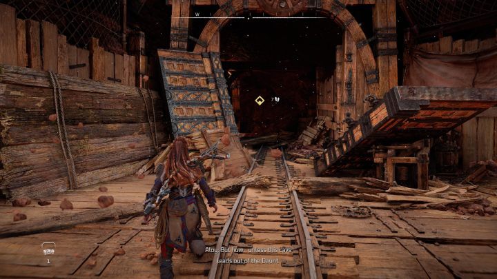 Follow the tracks. Once you find a blocked passage, turn right and go further through a narrow tunnel. Jump onto the rock at the end of the tunnel and climb up to get to the next part of the mine.