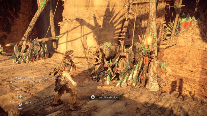 Jump up to the handhold and stand on the column. From here, you can easily shoot down all the machines in the pens. Using the Sharphot Bow, you will kill the Charger with 2 shots. Aim for its horns and the container on its back.