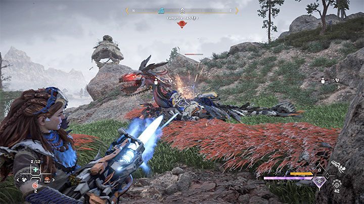 Only once you have travelled for a while will you receive the quest objective to battle the encountered machines. Try to focus on attacking one machine at a time, while at the same time avoiding attacks from other machines. Also make sure to scan the enemies to remind yourself of their elemental weaknesses.