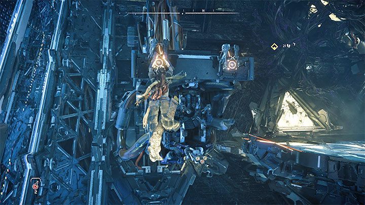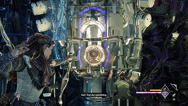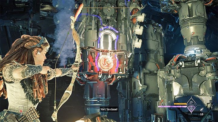 Once you reach the higher platform, you will have to solve a puzzle that is exceedingly similar to the first one. Aloy will ask Zo to stand on the pressure plate downstairs. Again, this will slow down the gears and allow you to target the exposed parts. Just like before, make sure to wait for them to move into the correct positions.