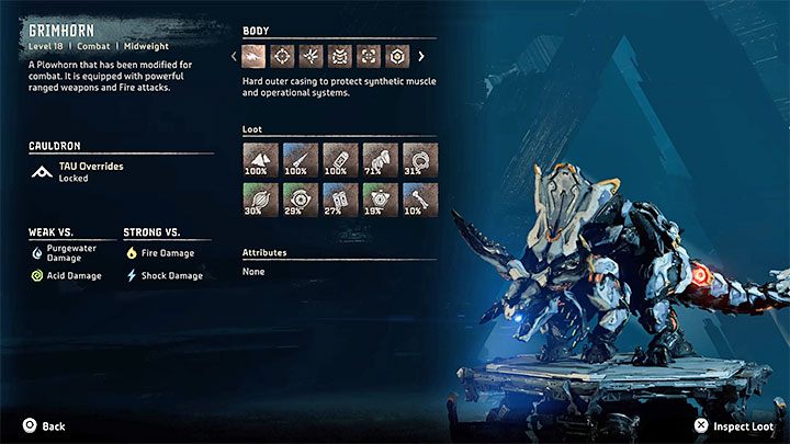 Reading the Grimhorn's entry will tell you of the boss' weak spots. Those are the horns, the tank on its back, the tail and the Cluster Launcher. If you attack the launcher you can eventually detach it, pick it up and use it as a heavy weapon.