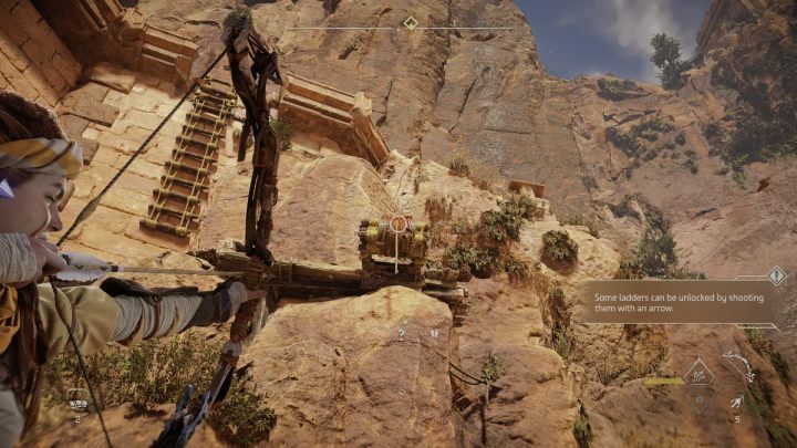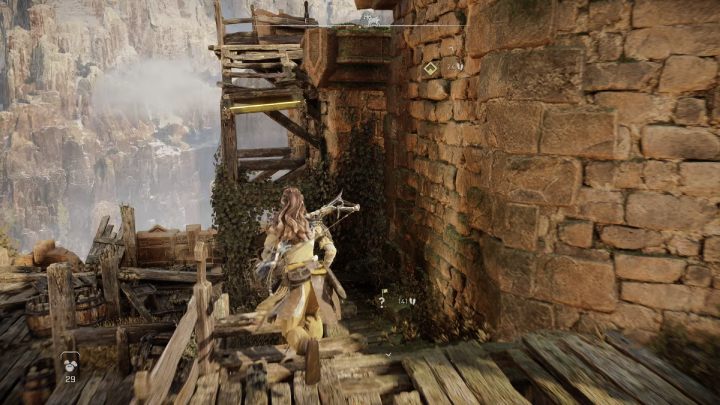 Lower the ladder with your bow and climb up the rock. Use the next ladder to reach the upper level, cross the bridge and go upstairs. Walk along the path until you come across a destroyed ladder on the ground.