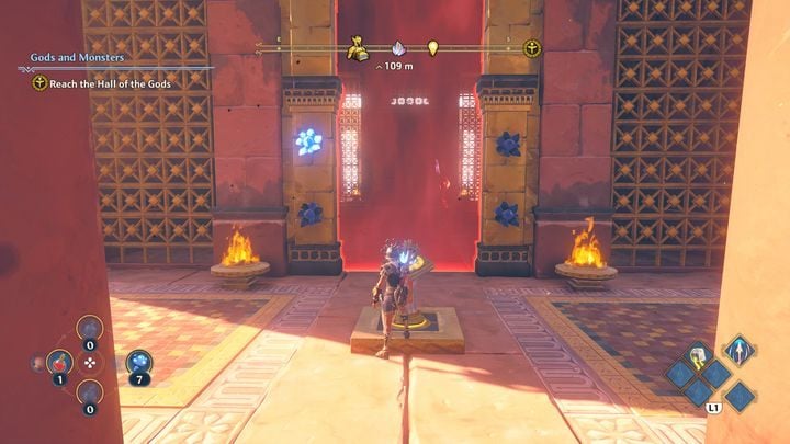 On the left side there is a statue, and there are several stones next to it. Pick up a stone and then throw it at a point above the red barrier. There is a cracked wall there, blocking access to a target. After the wall is destroyed, shoot an Arrow of Apollo at the target, which will cause the red barrier to disappear. Inside you will find the second switch.