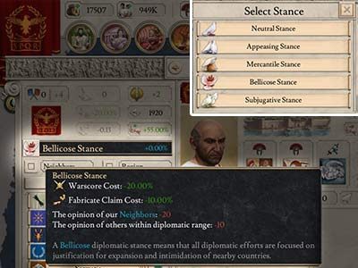 The diplomatic stance is your general attitude to all states. Each stance offers bonuses and has some restrictions. For example, the mercantile stance reduces the cost of creating trade routes, increases revenue from trade and strengthens your reputation among other states. On the other hand, bellicose stance reduces your reputation among the neighboring states but reduces the cost of acquiring rights to the province (fabricate claim) and reduces the cost of the conquered territories which is charged as a result of the war (war score cost). Changing stance requires Oratory points - sometimes, changing your stance is useful when you want to conquer surrounding nations or increase trade.