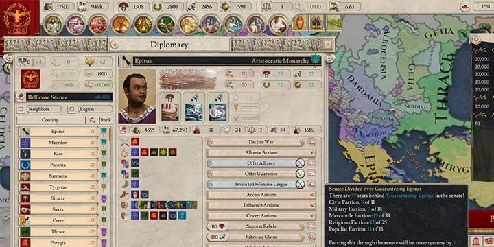 Thoughtful use of diplomacy will allow you to survive and succeed. If you play as a small nation, be sure to create a defensive league against the biggest force nearby. If you play as a powerful nation, watch what happens to your neighbors and use the intervene option to influence the fate of other countries and adjust the outcome of the war to your interests. Many of these actions require Oratory points so make sure you have enough of them and refrain from introducing new laws and assimilating subjects.
