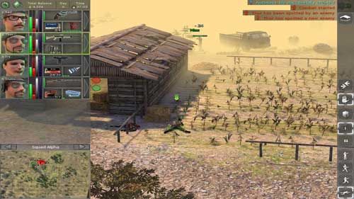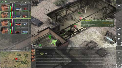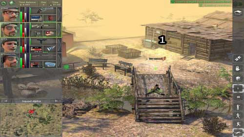 The most dangerous enemies are those by the truck. They have bigger firepower and shorter reload time guns so we have to shoot them out from a distance. From a position shown on an above illustration you should make it without problems. But keep Red nearby in case of difficulties.