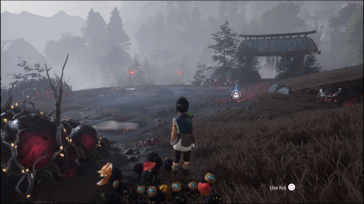 Then throw the bomb at the glowing rocks. Some ranged enemies will appear on the other side. Defeat them, then use the original Rot form to walk to the other side.