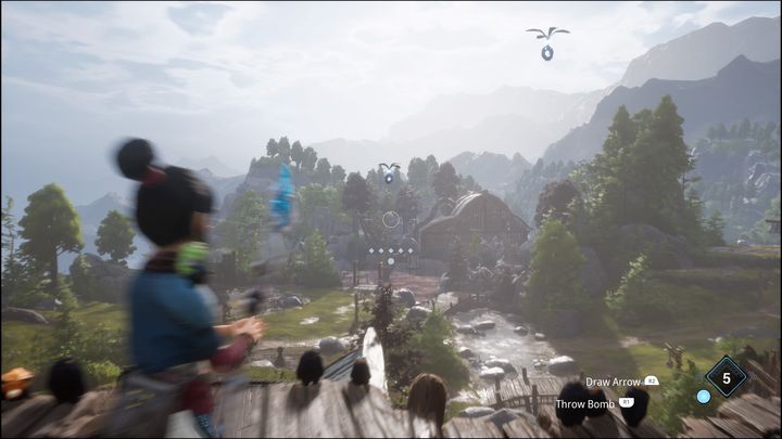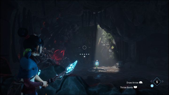 After jumping down from the edge you'll be attacked by four flying creatures. Shoot them down with your bow. Then throw the bomb at the glowing rocks.