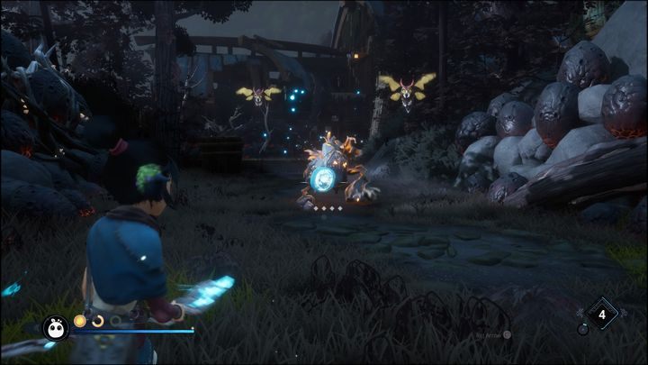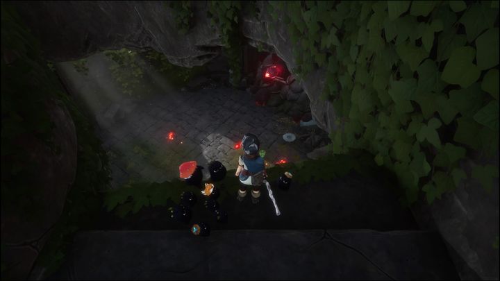 Proceed, and you'll be attacked by a new enemy. It's a small creature carrying a red bag. These enemies are walking, leaving bombs which detonate as soon as they get close to you. Shoot them from far away with your bow. A quick, uncharged shot is enough to deal with them. Once you defeat them, two flying creatures and a golem will appear - you need to kill it with a bomb, then an arrow.