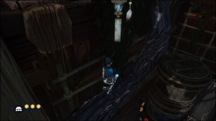 Then jump onto the root. In the spot shown on the picture jump onto the barrel, then jump onto the ledge and crab it, climbing up.