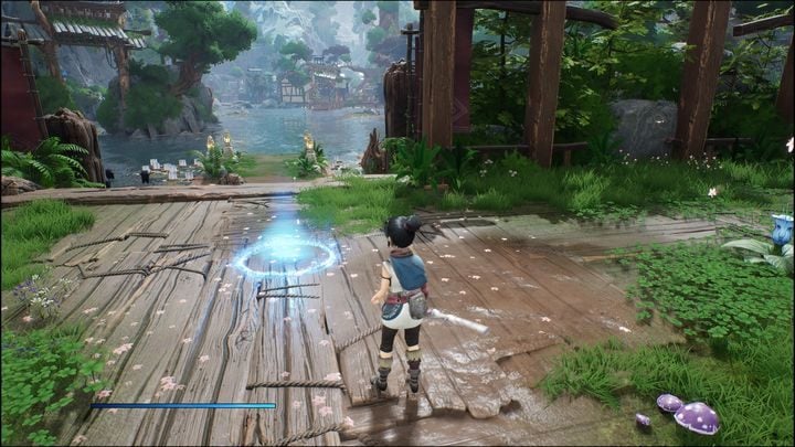 - Go to the Rusu Mountain location, and after you get the bow, you will be able to activate the bridge. After crossing the bridge, there will be Rusu on the left and a path to the Wood Knight and Warp Stone boss arena called Rusu's Backyard. On the right, you will see a blue flower. Shoot it to get to the Meditation Spot.