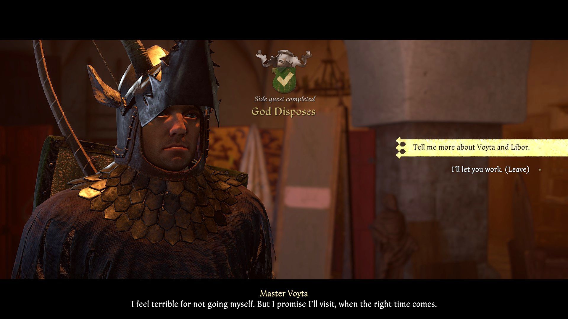Once you reach the bandits' camp, do not kill Burkhard. The best thing to do is to sneak in there at night and steal the killer's helmet from the chest. Return this item to the painter and lie to Voyta saying that Burkhard is dead - you have to pass a persuasion skill check.