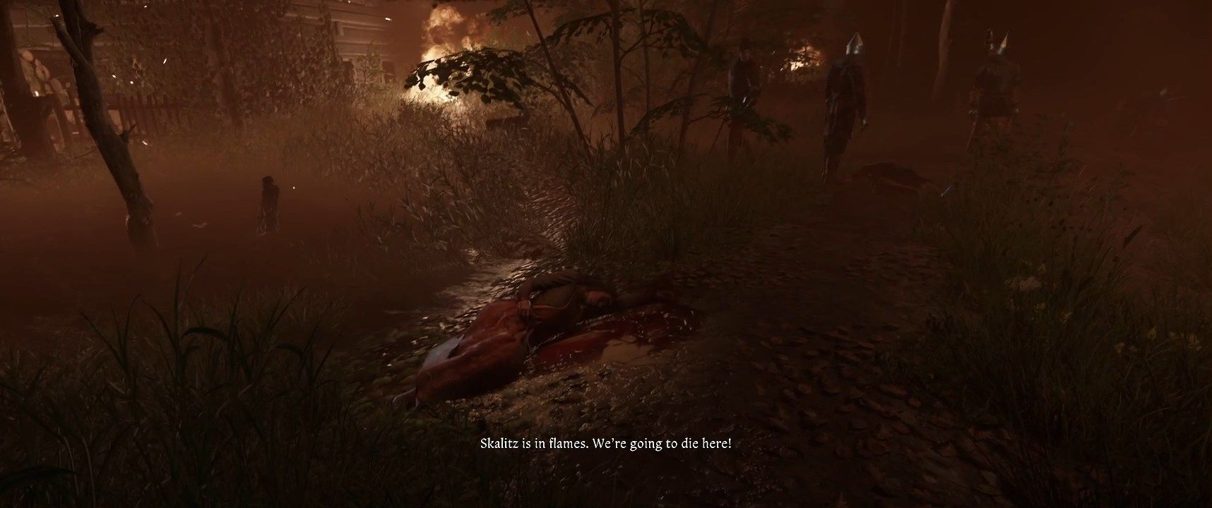 The quest opens with Henry being carried by Hans Capon. Choose any dialogue options while watching the visions that the severely injured Henry is going through. Eventually, you will reach the herbalist Bozhena's cottage. After the cut-scene, you will wake up the next day - this time it's Hans who needs your help. First, however, you need to fully recover. Open your inventory and use four bandages to stop the torso bleeding. Next, approach the hearth and eat some goulash from the pot to satisfy your hunger - you can eat whenever you want. Then go out of the cottage to the yard. There lies the corpse of a bandit killed by Hans - search him, take and put on his clothes, and also take and equip the sword lying on the ground next to the body. Lastly, go to the tub of water and wash yourselves.