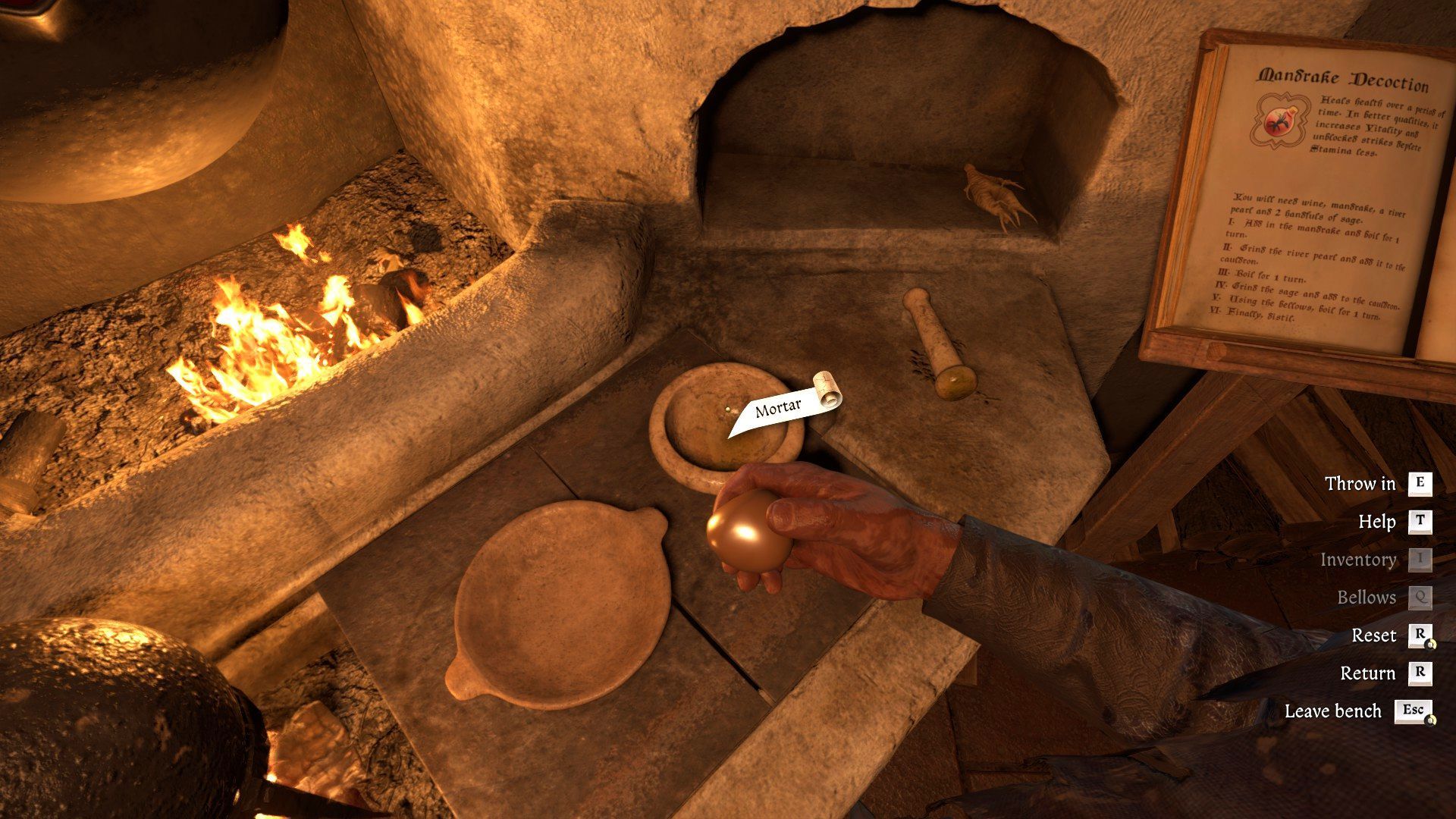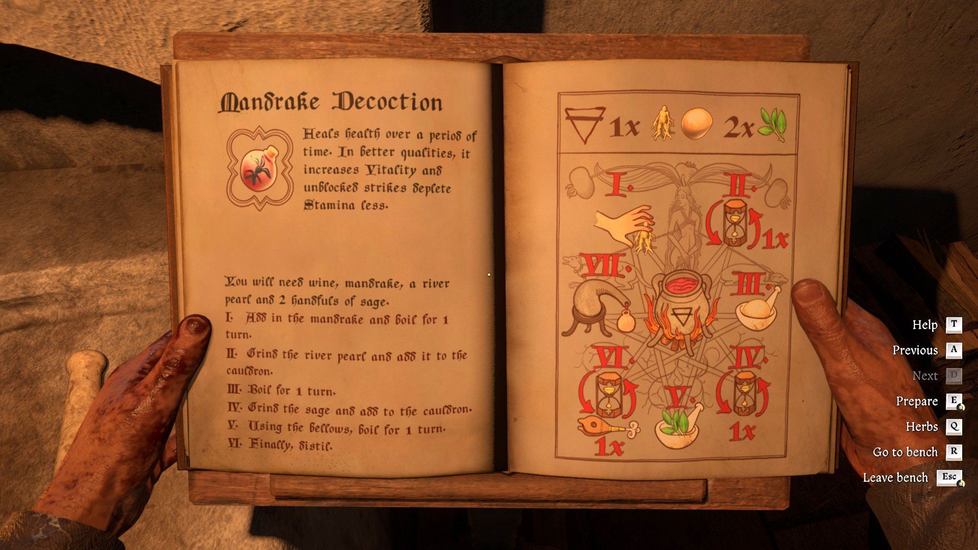 - After interacting with the alchemy bench, start by finding the Mandrake Decoction in the recipe book. It should be on the last page. All the required actions are listed there.