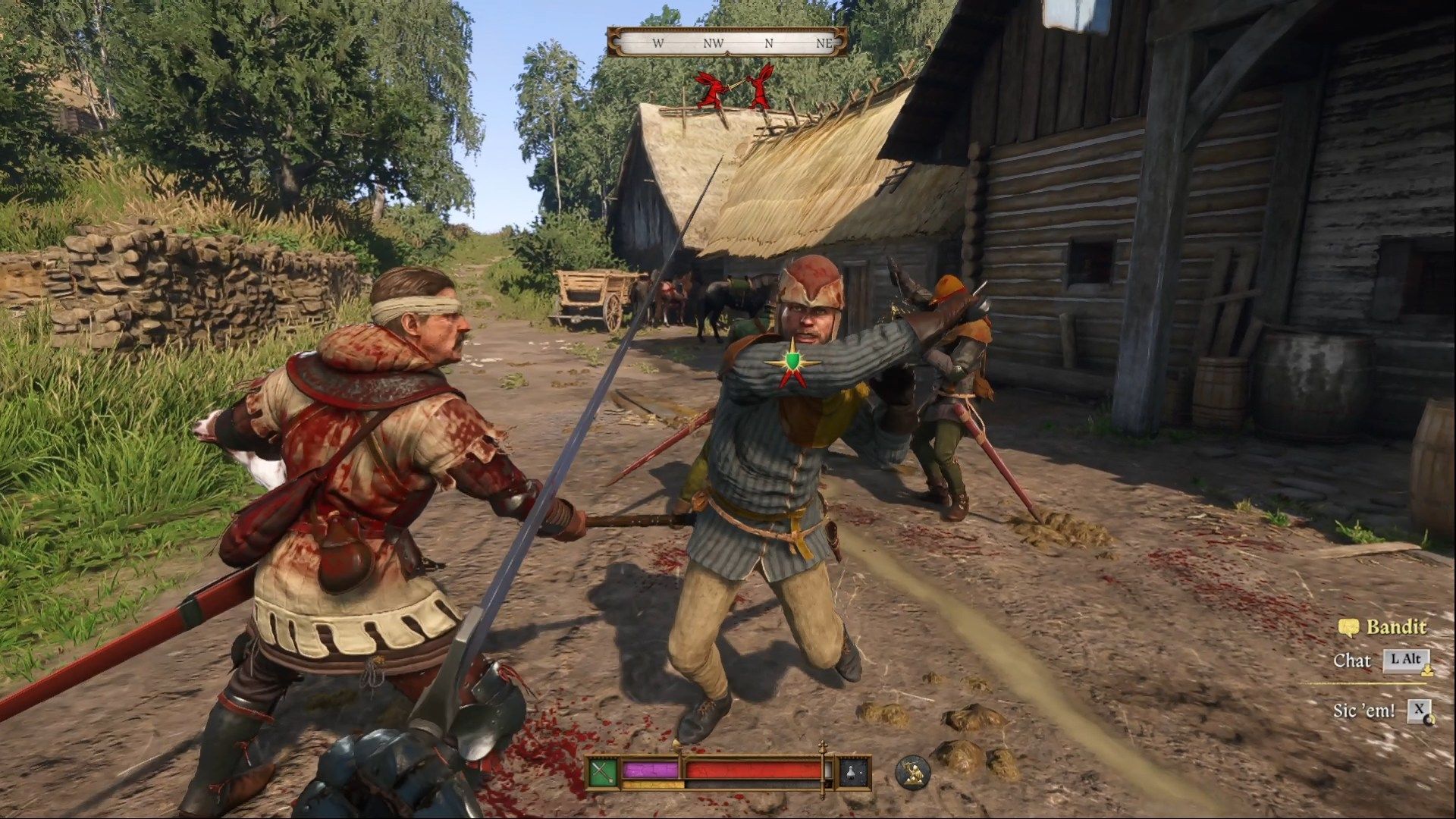 The quest starts by following Zizka on horseback. He will take you to the tavern, where you will meet one of Dry Devil's men - Kubyenka. You will have to get him out of trouble - fight the bandits trying to kill him. They aren't well-armed so they shouldn't cause you any problems. During the following conversation, you will develop a plan for an ambush on the prison convoy transporting Dry Devil. First, however, you need a firearm hidden by Kubyenka. Follow him on horseback to the forest.