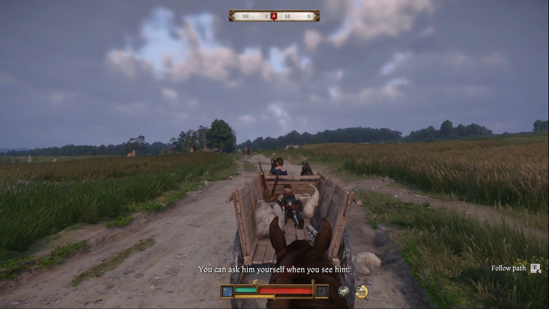 The quest starts by Henry following Katherine and Zizka on horseback. The horse goes automatically, you just have to answer the questions. You will eventually get to Suchdol, where you will meet Peter. Follow him to the dining room and talk to him there. After the conversation, take the food from the table to satisfy your hunger.