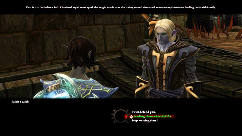Both fight are very similar, the only difference is that the First Scaith is aided by a group of skeletons. Regardless of your choice, in return for completing the mission you will receive a key to the nearby treasury and quite a lot of gold.