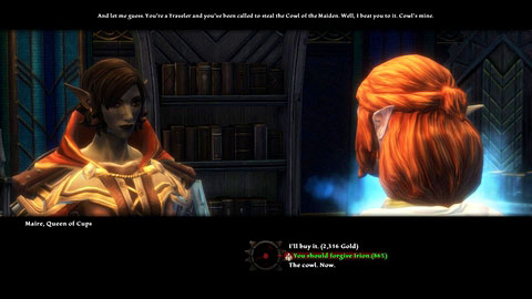 If you choose the lower dialogue option, you will need to steal the artifact from Maire by sneaking. The upper option can be used to buy the item back. The middle option implies trying to persuade her to give back the cowl.