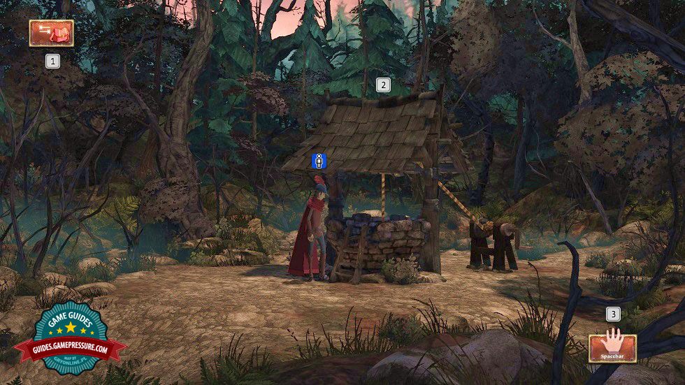 In this chapter, you can have a close look at the game interface in King's Quest. Each of its elements has been marked with an appropriate symbol and described in a lucid way, so that none of the beginner players should have any problems with starting into the game. Due to the fact that the interface is not too complex, the description has been limited to a handful of issues only. On the screen, you always see your character, who you control using the WSAD keys, as well as interactive elements. To activate them, you need to press the space bar. Apart from that, in the upper-left corner, there is the icon to access your inventory - you can access it by pressing the key TAB key.