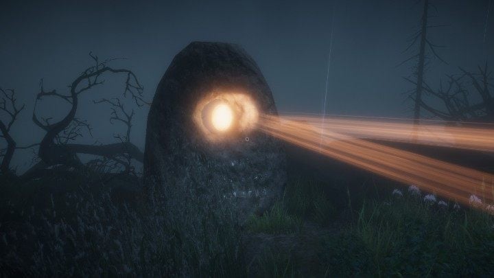 Return to the island and place the lamp where the bones were located before. Then go to each stone and put a lens inside. Your task will be to set the lenses in such a way so that the light will fall on the pile of stones.