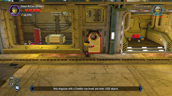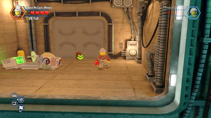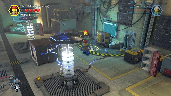 Make it over to the balcony, where there is a jetpack icon. You fly jetpack just like you fly the chicken. Also, the jetpack runs out of power, but the use is longer than in the case of the chicken. By flying it into the red activation fields, you can fly it for longer.