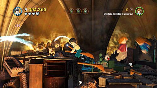 During the fire, we must go through the following levels. Extinguish the flames in your way. Go all the way to the right and jump to the upper floor. Use Wingardium Leviosa to rotate the car - the friends will go to the other side.