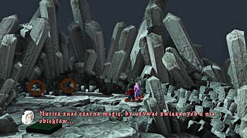 Approach the red wall and use the DF spell. Build a torch from obtained bricks, which can by lit from the one hanging on the rock. Burn the plants that block your way (use the torch).