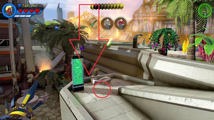 The next Minikit is located by the second fountain. You need to destroy five eye stalks, located randomly. All of them will appear in both water pools. Blast the fifth eye stalk to collect the Minikit.