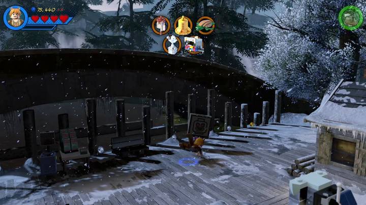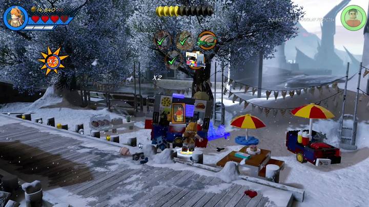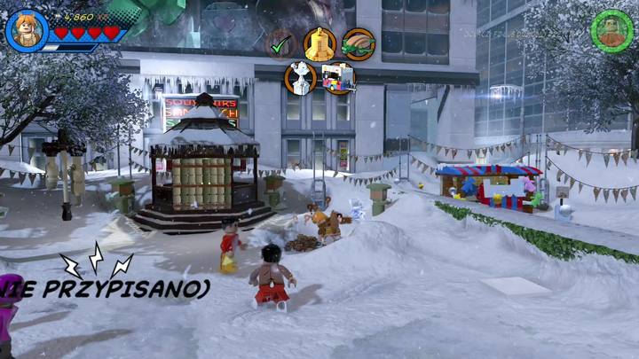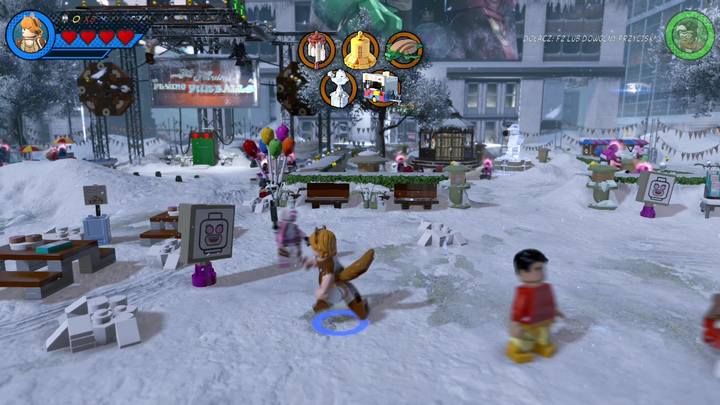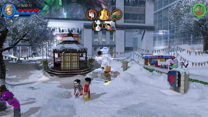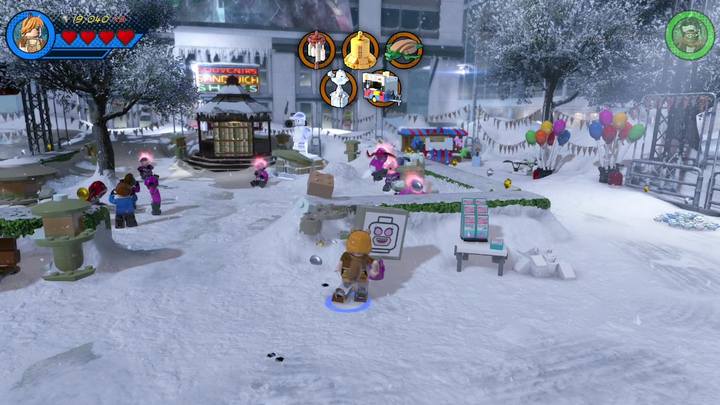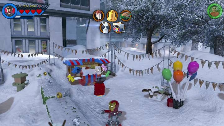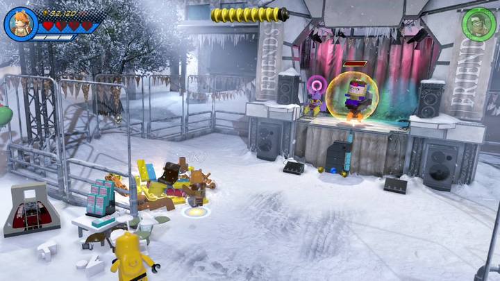 Switch to Squirrel Girl and approach the silver statue presented in the picture above. Blow it up and build a radio. Control it by using the control panel next to it. Everyone starts dancing but the radio but soon the radio gets destroyed. Use the scattered bricks and construct a decoration for a branch. This completes the first objective of this mission.