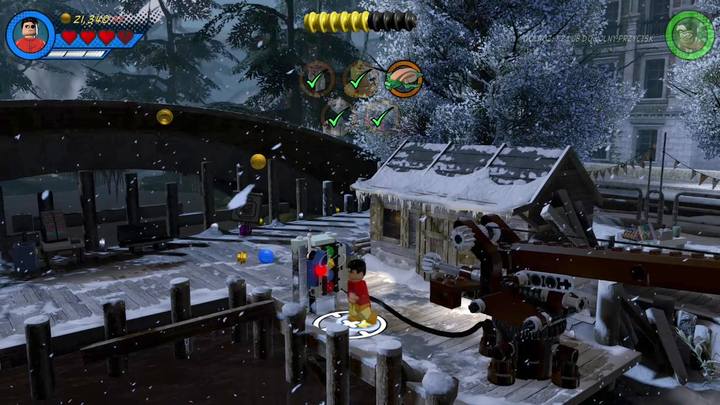 A pile of mud can also be found in the same place. Dig it up with Squirrel Girl and build a fountain out of the bricks (the second stage is now complete). Notice that two characters jumped out from the arbor next to you. Get inside it. Destroy containers that are inside and build green handles, you will have to pull them later. The entire construction made by you hits the bell. This completes the third part of the mission.