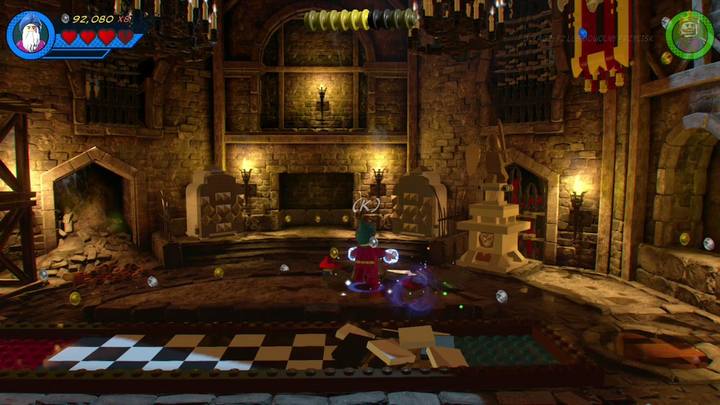 Morgan teleports her guardian. Start attacking her minions. Stand on the gold grate on the left and wait for the robot to shoot gold laser beams. Use the robot's beam to destroy the golden grate. This releases more bricks. Use them to build a jester's hat and, as Merlin, put it on the robot.