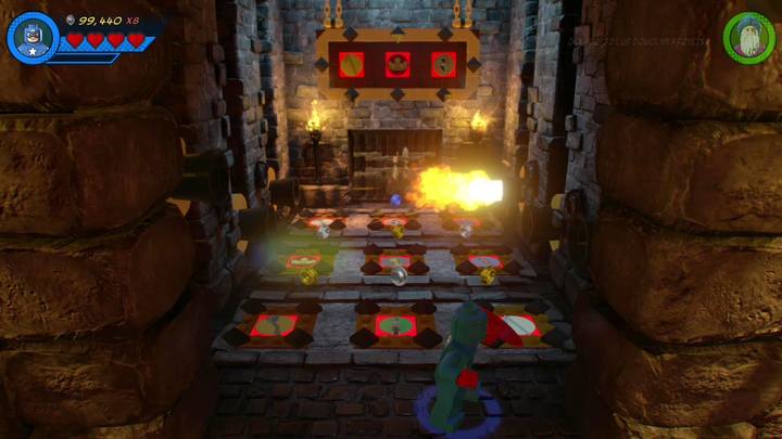 Only one character needs to reach the other side. Enter the main chamber when you are ready and face Morgan Le Fay. Use the bricks on the ground and build a platform. Then, jump on it as Merlin. Draw the correct shape to open the nearby gate. The room has now more bricks.