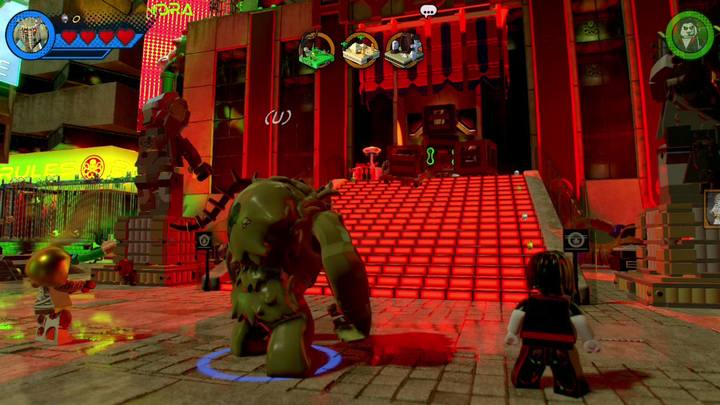 Control Man-Thing and approach the Hydra's main entrance. Destroy the boulders and use the green handlebars to move the container. Then, switch to Living Mummy. Destroy two statues near the stairs and use the bricks to create the first object.