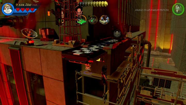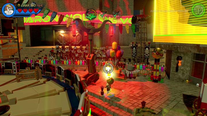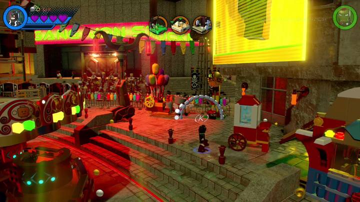 Switch to Morbius and go right. There, you can find the booth presented in the picture. Control the character inside and pull the lever. This makes the carousel go really fast. It also destroys objects that are around it. Use the bricks near the scaffolding and build a hook. Switch to Living Mummy, use his rope and go up.