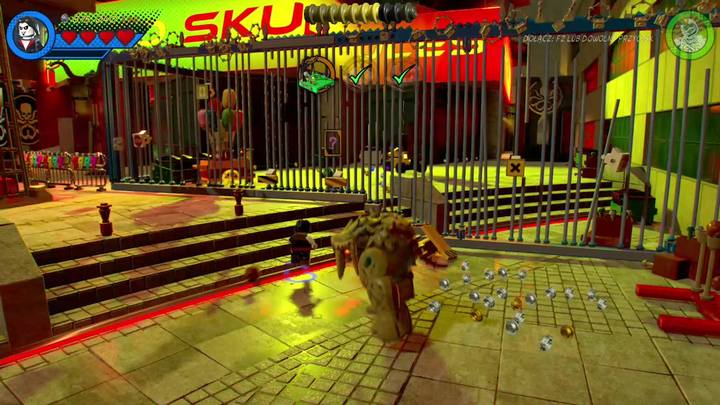Go left, switch to Morbius and start controlling the character behind the fence. This allows you to destroy a few nearby objects. You should also destroy the forklift that has just drove through the gate. This spills bricks in the center of the location. Use them to build a green platform, switch to Living Mummy and use his rope on the platform. Thanks to that you can destroy the LEGO objects next to it. Build a hydrant and an arm. Push the arm to turn the hydrant, put out the fire and water plants. This completes the third stage and the whole Gwenpool's mission.