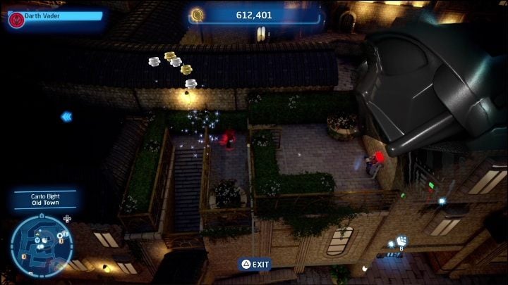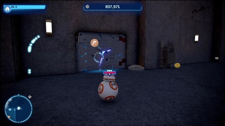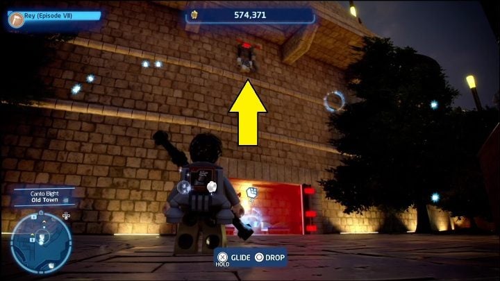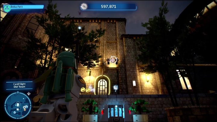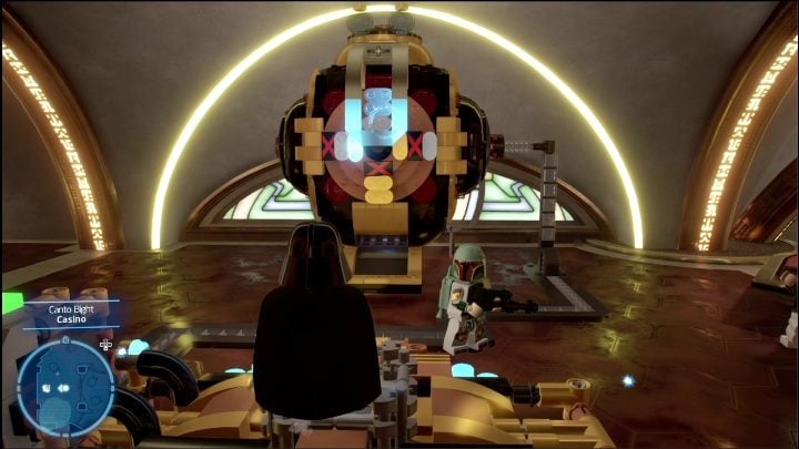 To get this brick, you need to complete several tasks. The first one requires the help of an astromechanical droid, which must take care of the terminal inside the building. After completing the minigame, select the Bounty Hunter and go to the tower. There are 2 yellow bricks around the blockade that you must destroy with the Hunter's firearm. This will destroy the barrier, allowing you to go inside.