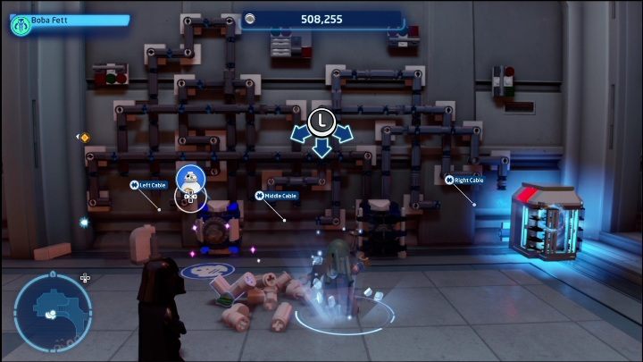 Obtaining this collectible requires solving a puzzle. For this, you need two characters, one of which must be an Astromech Droid. After starting the terminal, electricity will flow between the pipes, which have to be set in the correct order. You must constantly monitor the flow of electricity and move the pipes to complete the task.