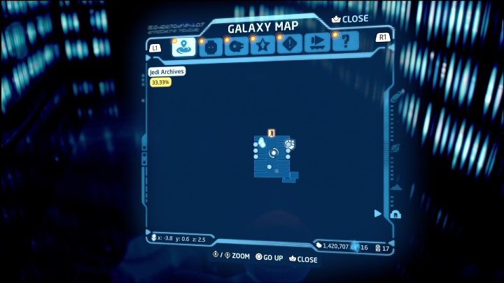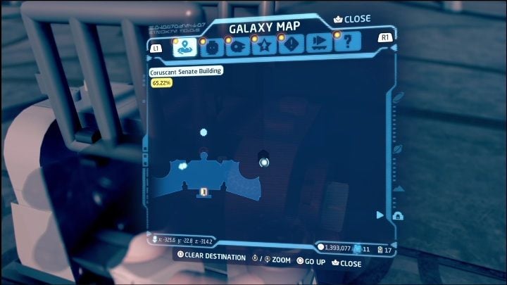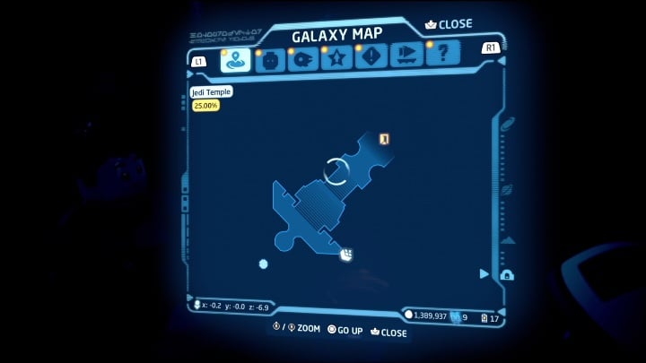 This collectible is on top of several platforms. You need two active characters for this quest. However, first you need to release the platforms by using the astromech droid terminal. Then move upwards by launching specific platforms. Use one character to climb up, and with the other, reorder the moving elements.