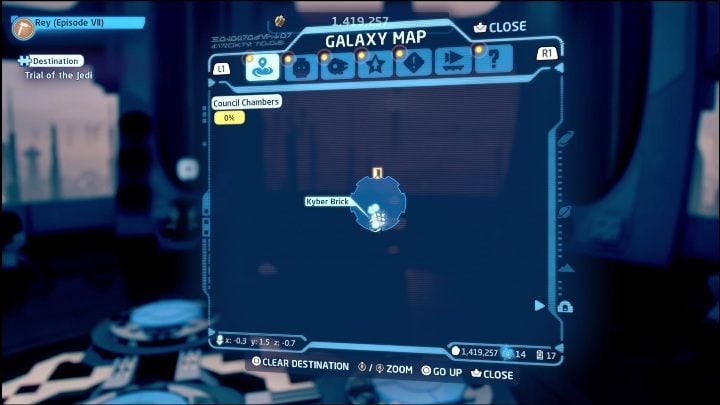 To get this brick, you need to perform a Jedi test. There will be 3 clouds above the character's head, which you can "open" with the force to see what they are thinking about. There are 5 buttons in the center of the room: a ship, a weapon, a lightsaber, a planet and a mug. Go from the left figure to the right. Find out what they are thinking and then click the correct key. If you give the right answers three times, you will pass the test and receive a Kyber brick.