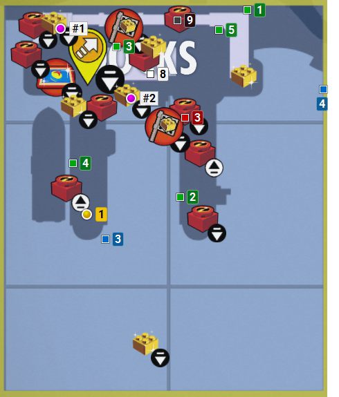 The map above depicts the Docks in LEGO The Incredibles; it contains markers of super-bricks, Super builds, gold bricks, and races. In addition, the map depicts the following objects using corresponding colors: