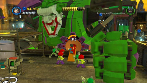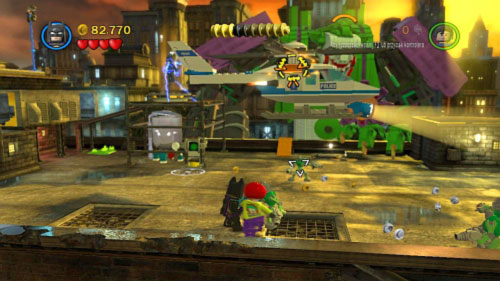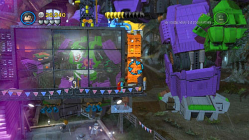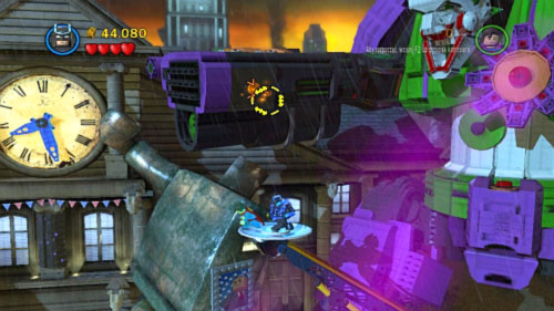 In the next location use bricks on the right to build a chopper. Use Batman's rope on the chopper's handle (picture) and then press "U" in order to get inside. Fly exactly in front of robot and shine the light at his face.