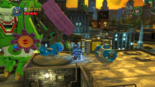 When the chopper falls down move to the right and destroy golden plate. Get inside the building with Batman and then move right. Wear a bat suit, fly to the right and destroy blue bricks. From the remains of the chopper build searchlight and electric supply machine. Wear Batman into electricity suit and activate the searchlight (picture). Use it and direct light stream at robot's face.