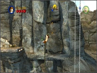 As Indy, jump to the right using your whip and climb up using rope. Jump to the left and join the rest of group. Use your whip in the highlighted place. Build a ladder from LEGO pieces and go up.
