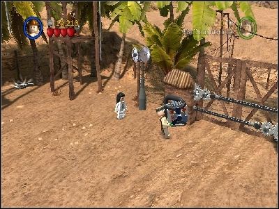 Defeat your enemies and destroy everything on your left side. You should find a shovel. Take it and dig up a box - you will find a key in it. Notice two towers to the right near the gate. As Marion (or Indy, thou it is easier to do all this staff with Marion) jump to the left tower and hang on the rope. You will see LEGO pieces - compose a lever from them and use it.
