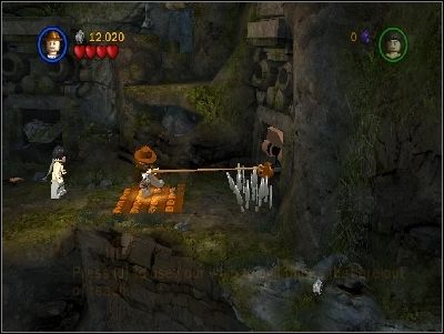 On the other side use the whip on the highlighted place. It will make Indy to catch lever witch the whip and pull it. Make a ladder witch LEGO pieces and climb up. Get on the hanging rope and jump right. Go all the way to the right and run through the bridge which will fall down after you.