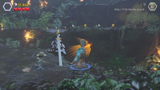 You can get the first minikit as dilophosaurus. Destroy three objects shown on the picture with his venom. First one can be found on the right side, second on the left, and third next to the burning car.